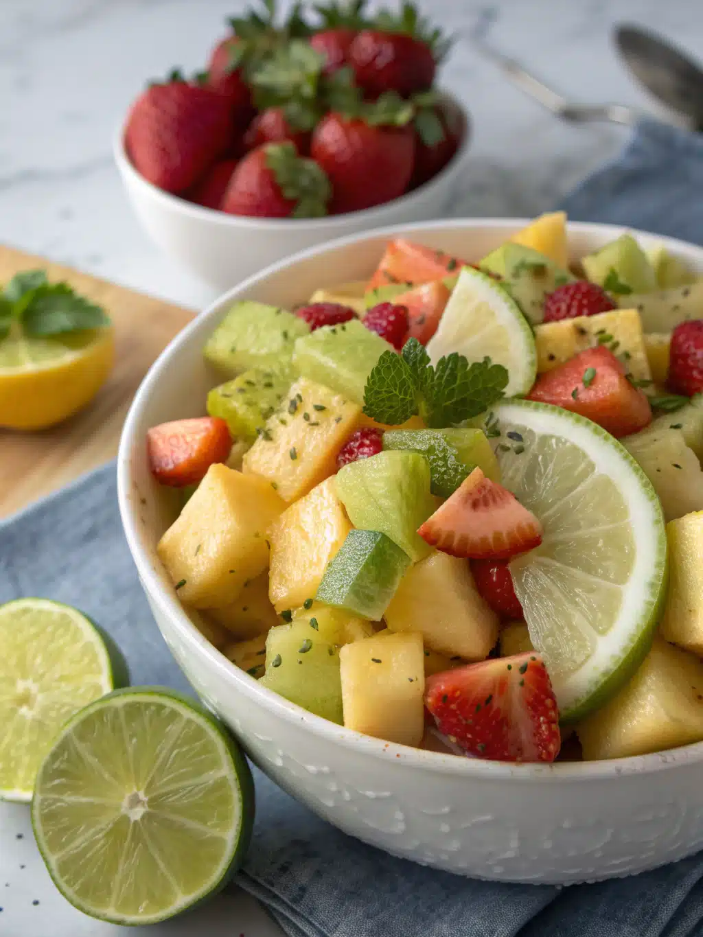 A: The natural fruit sugars and added honey raise this dish’s glycemic load. Diabetics can enjoy it in moderation (½ cup serving) or modify by reducing honey to 1 tablespoon, increasing lime juice, and focusing on lower-glycemic fruits like berries and grapefruit. Adding nuts or seeds slows sugar absorption. Always consult with a healthcare provider regarding individual dietary needs.