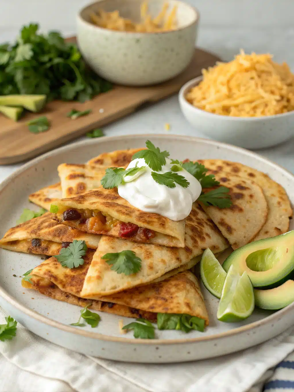 Arrange quesadilla wedges on a large platter with small bowls of sour cream, guacamole, and salsa positioned around the perimeter. Garnish with fresh cilantro sprigs and lime wedges.